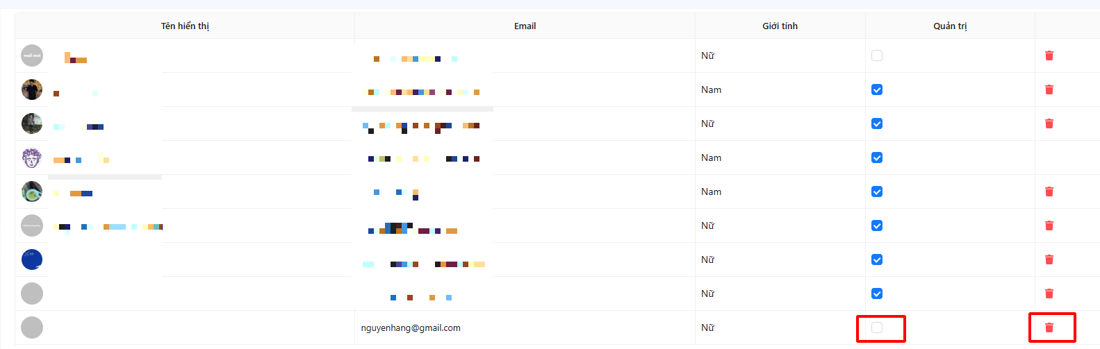 - Nếu muốn phân quyền email là tài khoản quản trị thì check chọn vào cột “Quản trị” tương ứng với email cần phân quyền.
