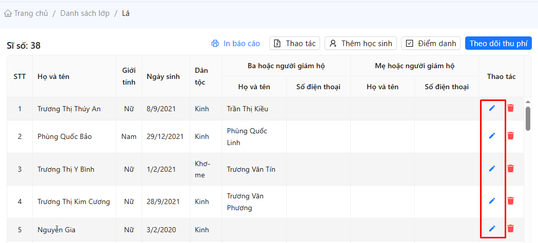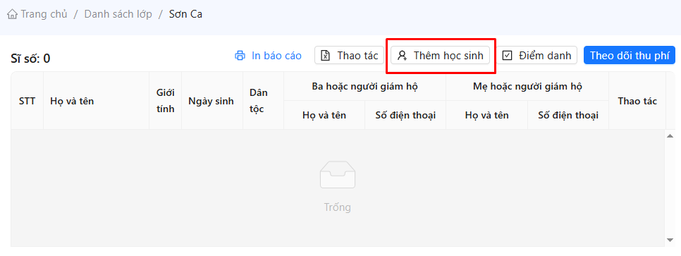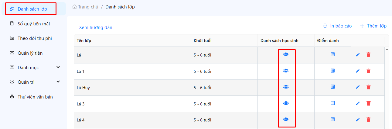 Vào chức năng Danh sách lớp -> Danh sách học sinh (biểu tượng tại cột danh sách học sinh)
