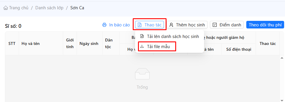 Bước 1: Bấm vào nút Thao tác chọn Tải file mẫu để thực hiện tải file mẫu học sinh về nhập thông tin.
