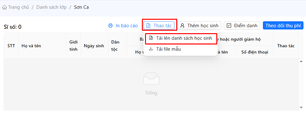 Bước 3: Bấm vào nút Thao tác rồi chọn Tải lên danh sách học sinh và thực hiện chọn tới file học sinh mẫu đã làm để đưa dữ liệu lên phần mềm.