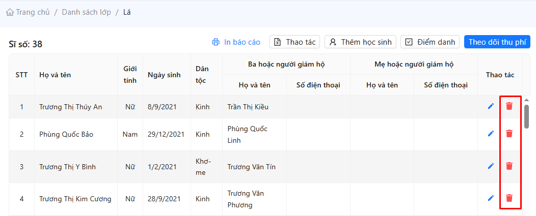 Bước 1: Bấm vào biểu tượng nút xóa(hình thùng rác màu đỏ) tương ứng với học sinh cần xóa.