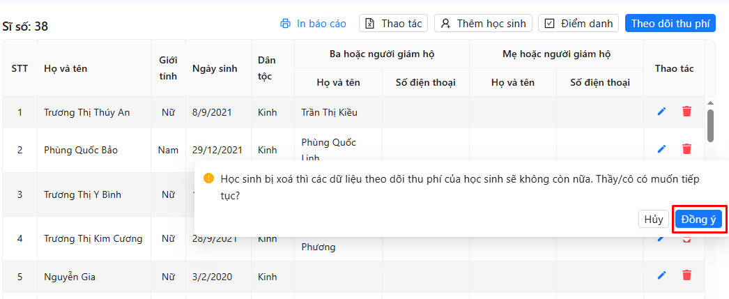 Lưu ý: học sinh bị xóa thì các dữ liệu của học sinh đó và theo dõi thu phí của học sinh này cũng sẽ bị xóa theo và không thể khôi phục được.