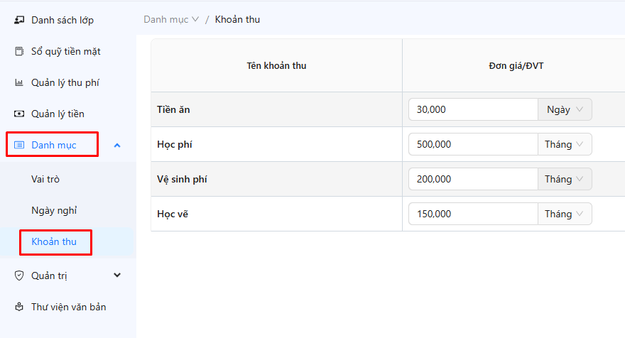 - Tên khoản thu: Tên khoản thu như: học phí, tiền ăn, vệ sinh phí,…