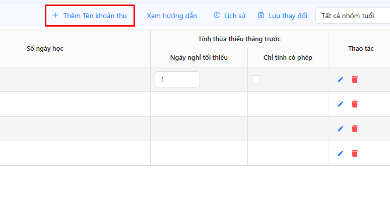 Tất cả nhóm tuổi - Đơn giá: Nhập số tiền sẽ thu cho khoản thu này và đơn vị tính (ngày hoặc tháng) tương ứng.