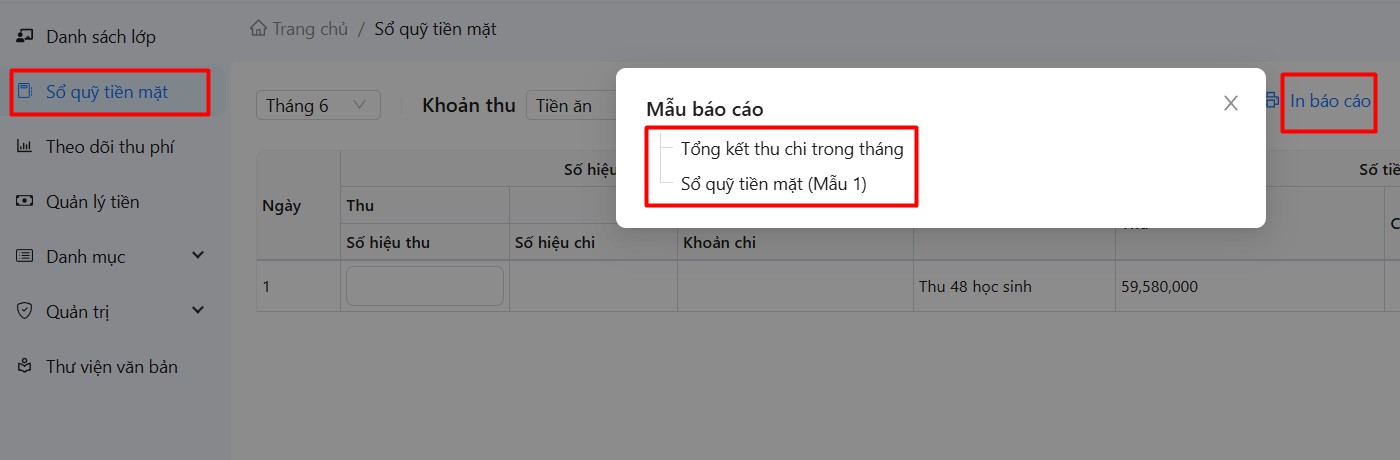 Bước 1: Vào menu Sổ quỹ tiền mặt -> bấm nút In báo cáo -> chọn báo cáo cần in