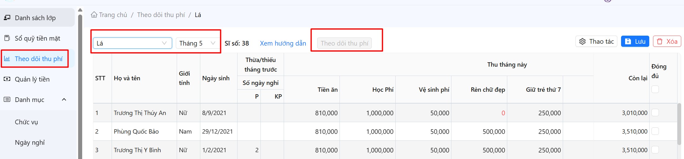 Bước 1: Vào mục Theo dõi thu phí -> Chọn lớp -> Chọn tháng -> Bấm nút Theo dõi thu phí phần mềm sẽ hiển thị giao diện như hình bên dưới.