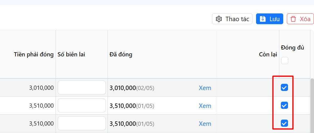 ✅ Tất cả học sinh đóng đủ: Check ô Đóng đủ ở dòng tiêu đề để chọn nhanh cho cả lớp.