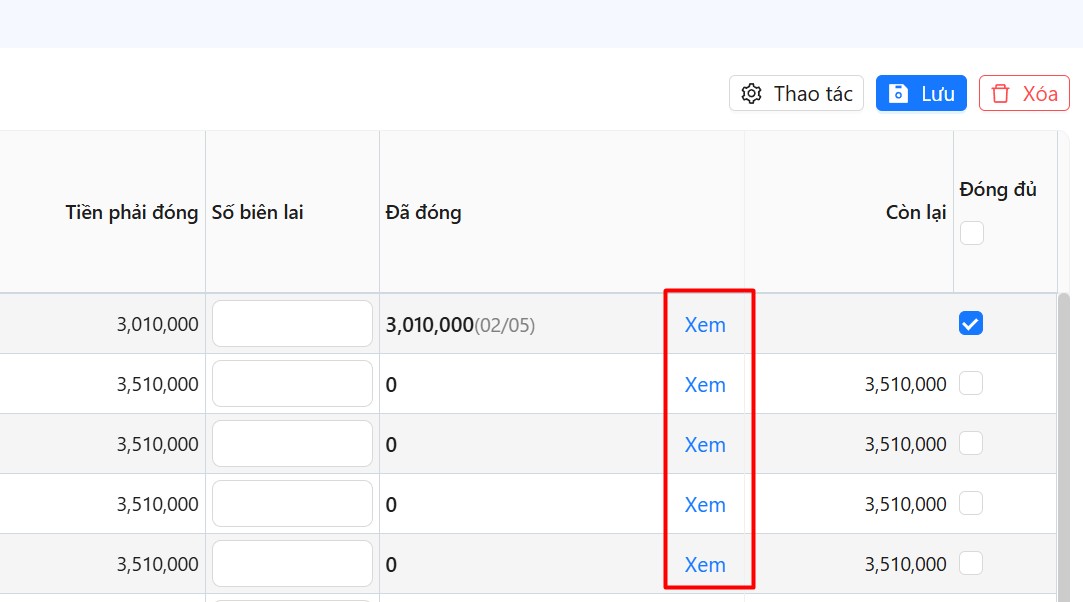Xem→ bấm nútThêm - Nhập ngày đóng và số tiền → Bấm nút