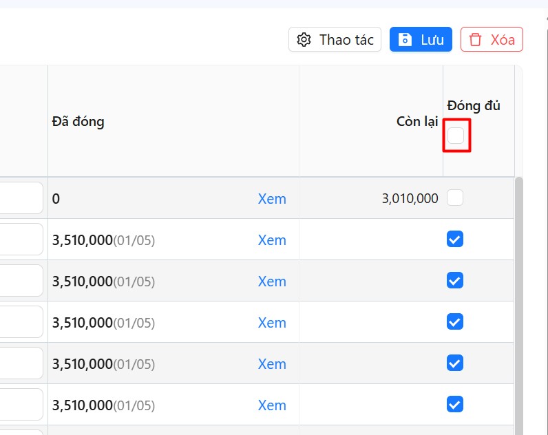 ✅ Phụ huynh đóng đủ tiền: Check vào cột Đóng đủ → phần mềm sẽ tự động ghi ngày đóng là ngày 1 của tháng.
