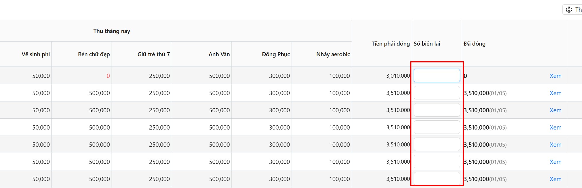 🧾 Số biên lai: Nhập số biên lai tương ứng vào cột Số biên lai để in báo cáo chính xác.