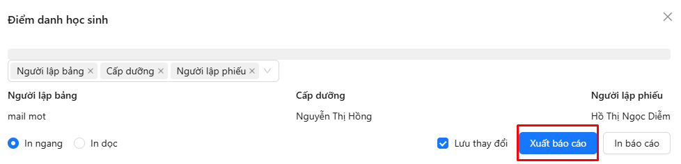 Bước 2: Chọn In báo cáo -> Chọn mẫu điểm danh học sinh